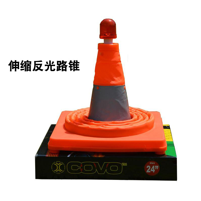 1.锥顶配有小圆灯(使用两节7号电池),开启时顶灯频闪,警示效果非常明显。在车辆发生故障时,司机可迅速地将伸缩锥取出,在夜间及其他需要光亮警示的场合下开启。锥身配有反光带。本品方便携带。适合于普通轿车配备的安全路锥。
