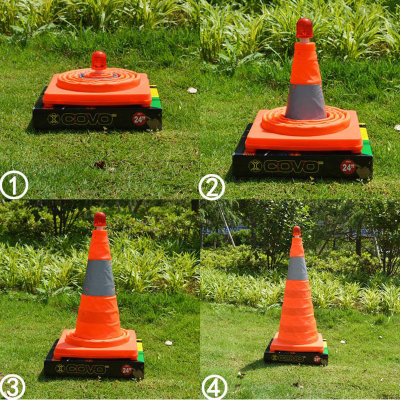 可折叠式路锥体积小,操作方便简易,便于携带,锥体采用软性好的防水反光牛津布,并配有反光带,底座为PE(质地轻、柔软、易造型、透光性好、无毒),顶端配装有闪光警示灯,闪光频率(150次以上/分钟),灯亮之后,夜间整个路锥都会亮,夜间或雾天效果。适用于配载车辆在行驶路中临时停告起警示作用及路面作业临时防围警示作用。